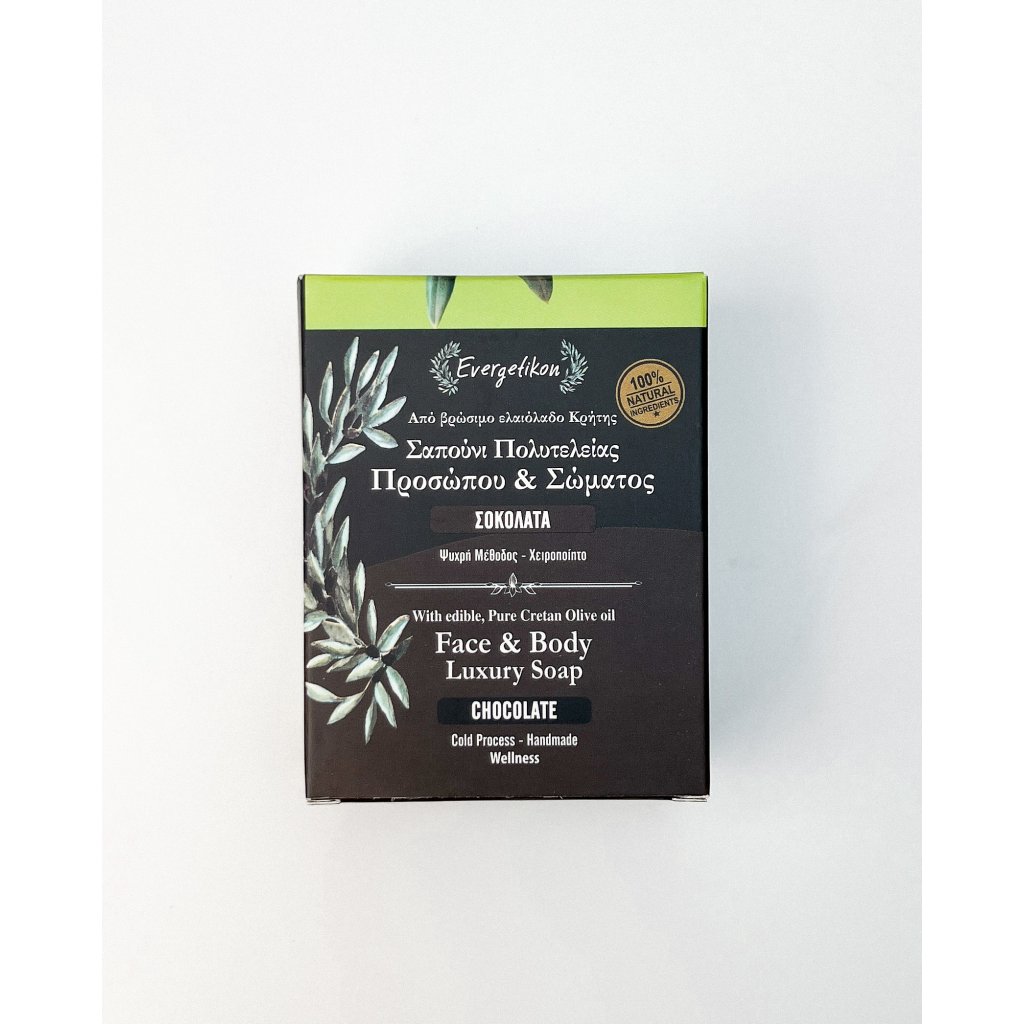 INCI: Olea Europaea (Olive) Fruit Oil Cretan extra virgin olive oil, Cocos Nucifera (Coconut) Oil, Aqua, Sodium Hydroxide, Prunus Amygdalus Dulcis (Sweet Almond) Oil, calendula officinalis flowers extract, Aloe barbadensls leaf Juice, Flavor Chocolate, Cocoa powder.