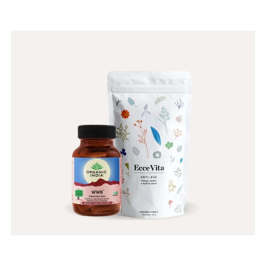 Podpora ženského těla zevnitř v období hormonálních změn. Výběrová kombinace bylinného čaje a doplňku stravy pro energii, rovnováhu a well aging.